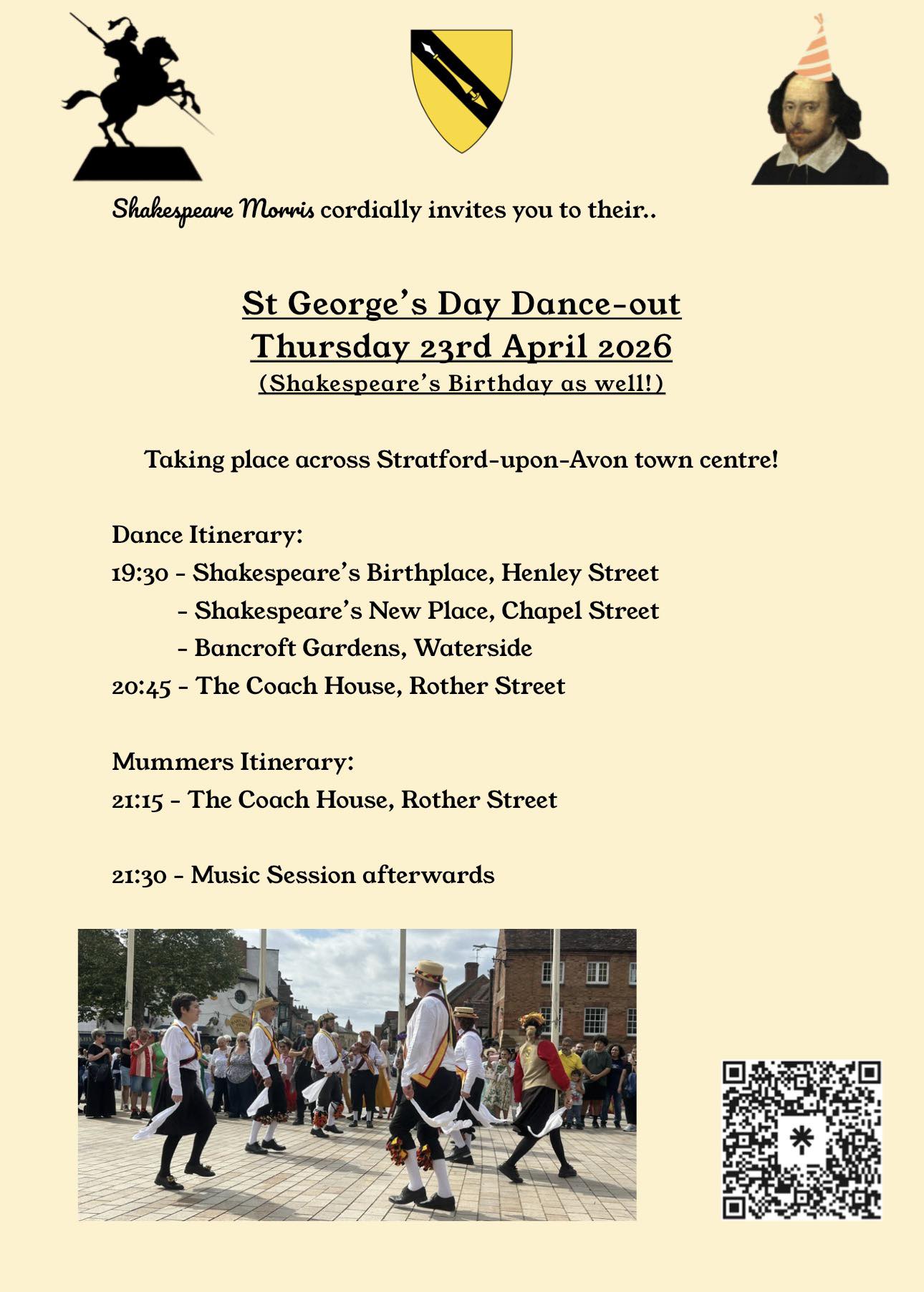 Ye merrie folk of Stratford-upon-Avon are cordially invited to join Shakespeare Morris on Thursday 23rd April 2026 from 19:30 onwards outside Shakespeare’s Birthplace for our St George’s Day Dance-out, as it’s also his birthday. This also marks the start of our summer programme!