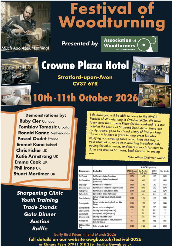 The Heart of England Woodturning Club is registered as a CIO and exists to promote the art of woodturning in the Stratford-upon-Avon area. The club meets at Bearley Village Hall, Snitterfield Rd, Bearley, Stratford-upon-Avon CV37 0SR on the second Friday of each month, doors open 6.15pm for a 7.00pm start.